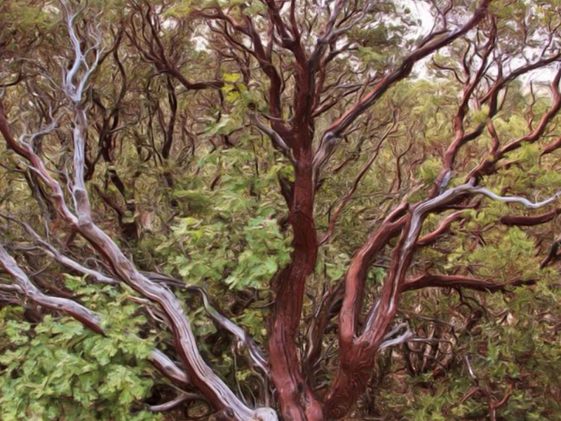MANZANITA is a common name for many species of evergreen shrubs or small trees present in the chaparral of western North America. They are characterized by smooth, orange or red bark and stiff, twisting branches.