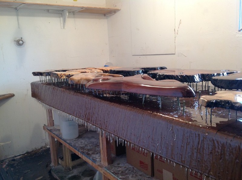 All of our tables are constructed on-site, in our workshop, by our own employees. Table tops are planned, sanded and given a resin or lacquer finish. Table bases are finished with lacquer unless otherwise indicated. Table tops and bases are joined toghther using dowel pegs and can be disassembeled and reassembeled for easy moving.